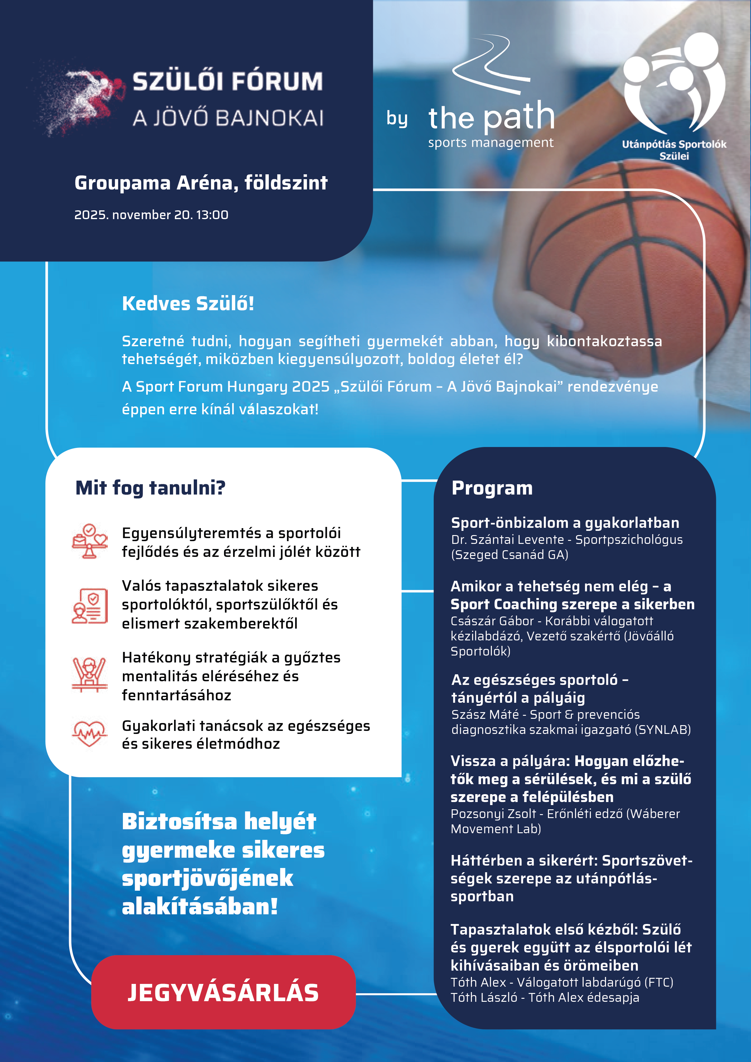 A Sport Forum Hungary 2025 kísérő eseményeként rendezik meg 2025. november 20-án, csütörtökön Budapesten, a Groupama Arénában a „Szülői Fórum – A jövő bajnokai” rendezvényt, amelyen jégkorongos és más sportágak szakemberei, edzői és szülői osztják meg tapasztalataikat arról, hogyan lehet egyszerre támogatni a fiatal sportoló fejlődését és lelki egyensúlyát.